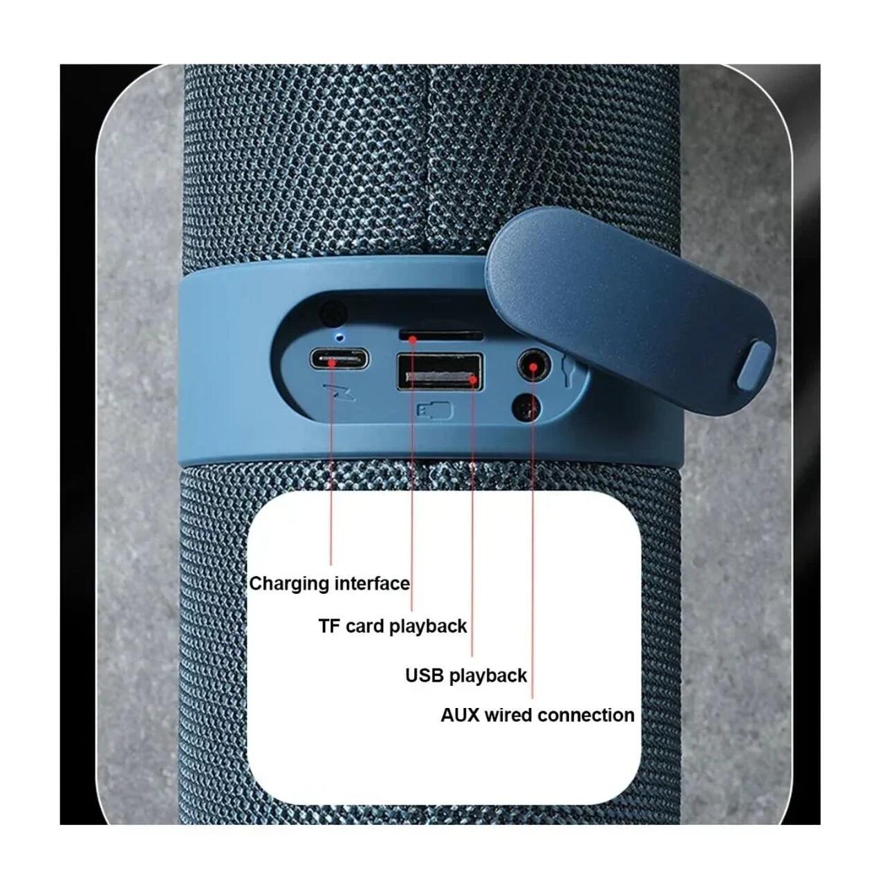- Conexiones múltiples: El altavoz incluye diversas opciones de conexión para mayor comodidad, tales como Bluetooth, AUX, USB, radio FM y tarjeta TF (MicroSD), permitiendo reproducir música desde diferentes fuentes.